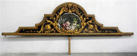 Sovraporta di forma sagomata ad olio su tela dipinto a rose entro cornice a volute (cm 230x60) (difetti)
