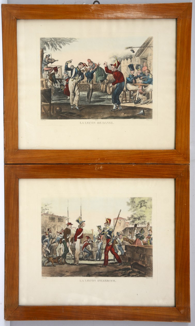 Coppia di stampe a colori raffiguranti soldati. In cornici (difetti)