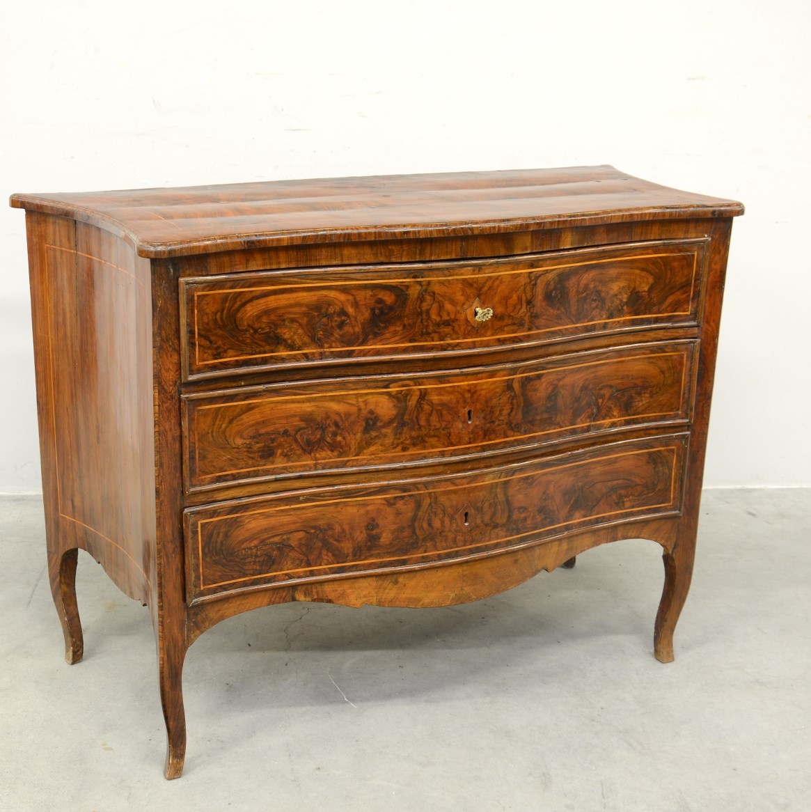* ComÚ di forma mossa in noce e radica con piano, fronte e fianchi filettati in legno chiaro, gambe mosse. Sec. XVIII (lievi difetti)