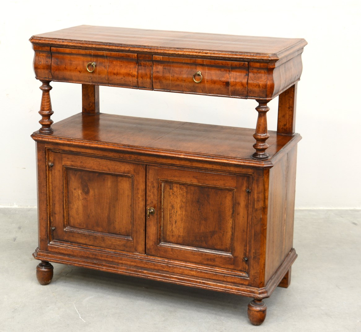 * Etagere a due ripiani con fascia superiore a due cassetti, montanti torniti, base a due ante riquadrate, piedi a trottola. Sec. XIX (cm 88x91x40)