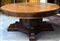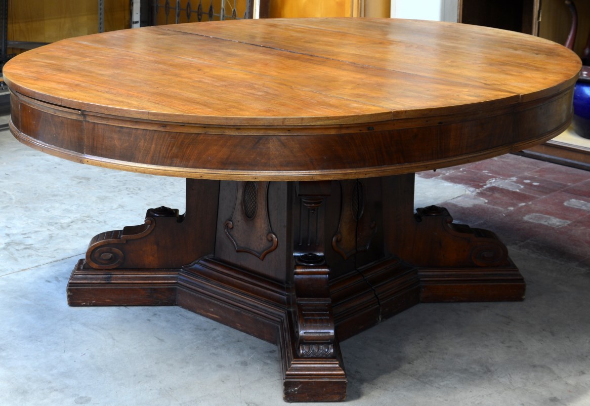 Grande tavolo allungabile di forma tonda con fascia lastronata in noce, gamba...