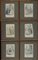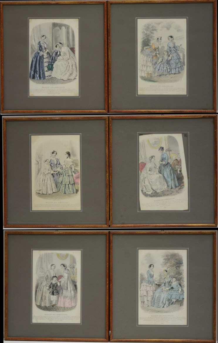 Gruppo di sei litografie francesi a colori raffiguranti donne in abiti ottocenteschi. In cornici (difetti)