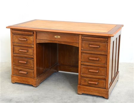Scrivania da centro rettangolare a un cassetto sottopiano e otto laterali sul fronte, tiretti estraibili. Anni '40 (cm 138x80x83)