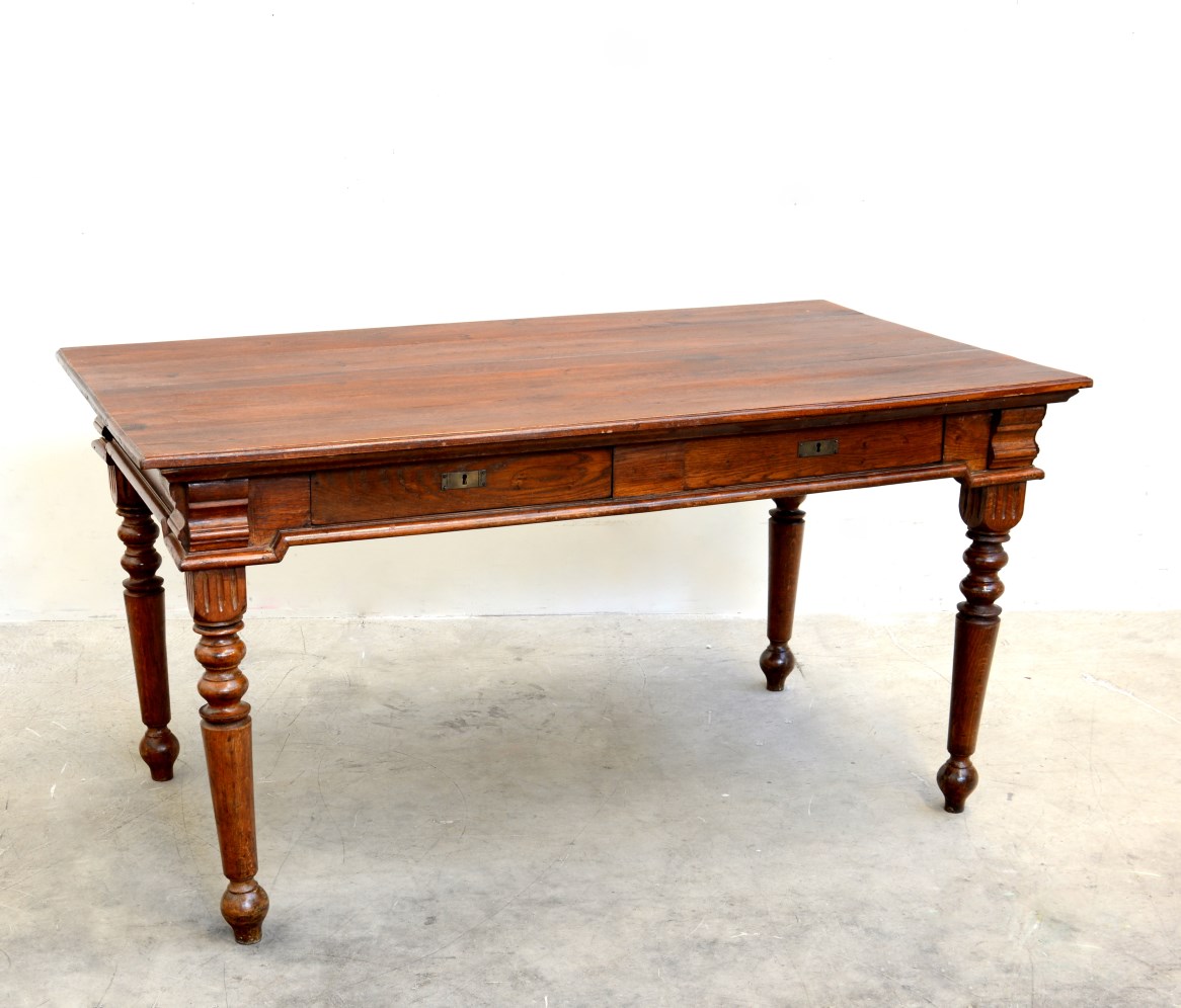 Tavolo rettangolare a due cassetti nella fascia. Piedi torniti. Inizio sec XX (cm 149x76x86)