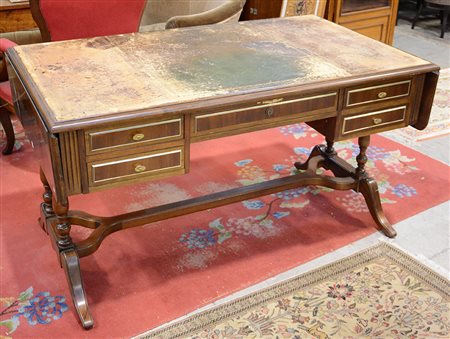 Scrivania rettangolare con alette a cinque cassetti sottopiano, gambe tornite riunite da traversa terminanti con piedi sagomati (difetti) (cm 140x75x81)