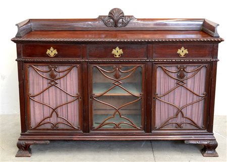 Vetrina con alzata in mogano a tre cassetti in linea sottopiano e tre ante a vetri sul fronte decorata con listelli sagomati. Piedi intagliati Inghilterra fine sec XIX (cm 160x105x51) (difetti)