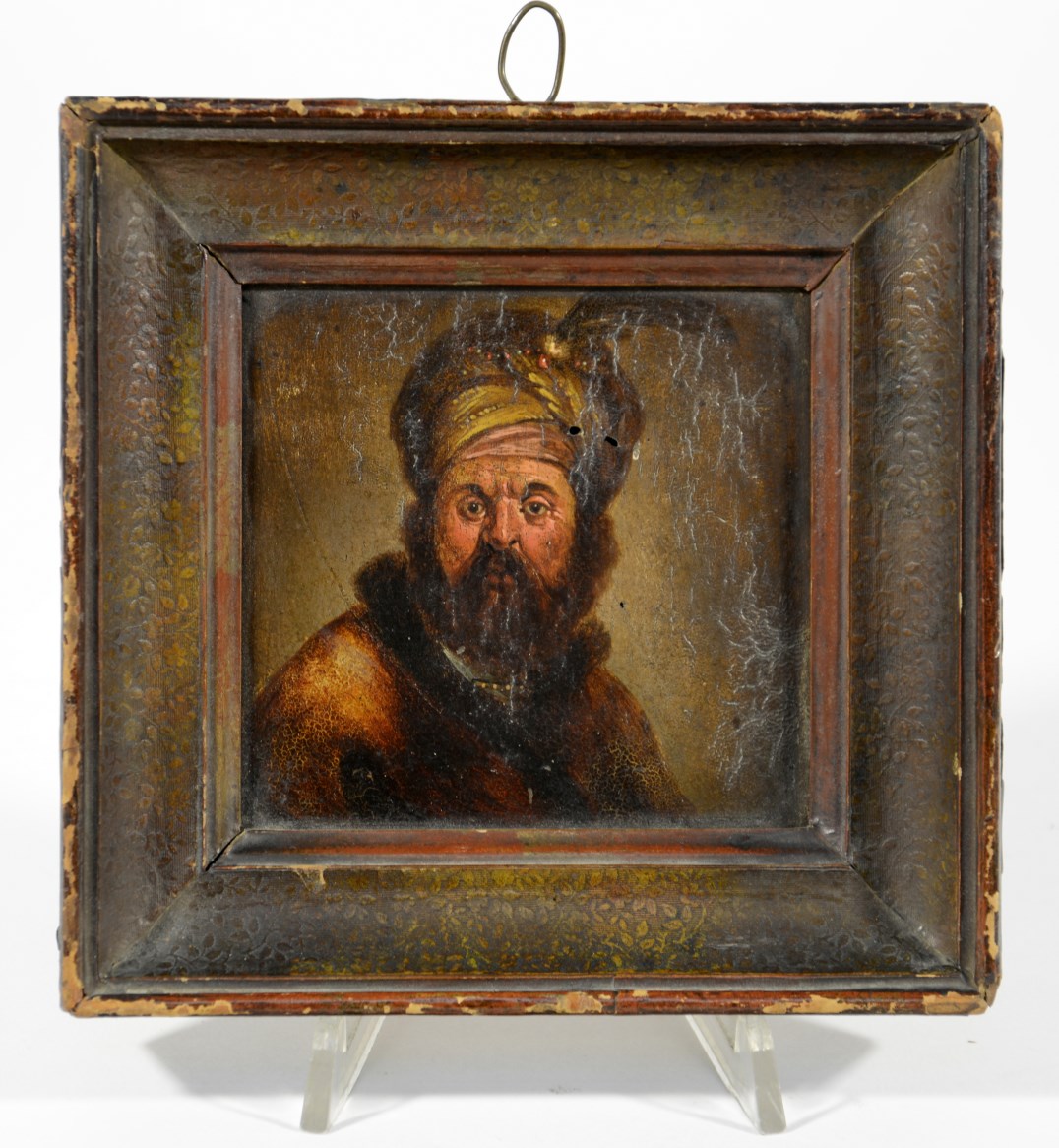 Ignoto, sec. XIX, "Ritratto di uomo con turbante", olio su tavoletta (cm 9x10). In cornice