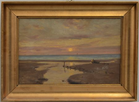 * Firma indecifrata "Paesaggio al tramonto" olio su tela (cm 26x40) firmato e iscritto in basso a destra