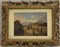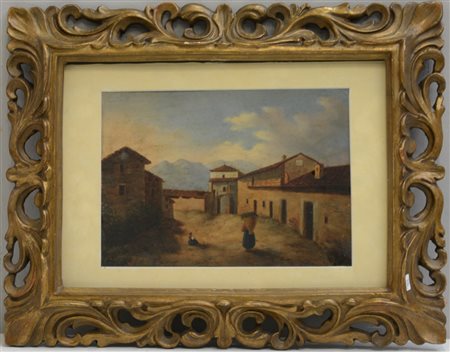 Ignoto. "Scorcio di paese con contadini" olio su cartone (cm 19x26) In cornici