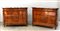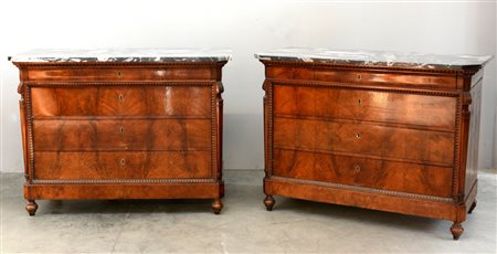 Coppia di comÚ lastronati in radica di noce a un cassetto piccolo sottopiano e tre grandi sul fronte. Montanti sagomati e scanalati. Piani in marmo. Sec. XIX (cm 130x95x63)