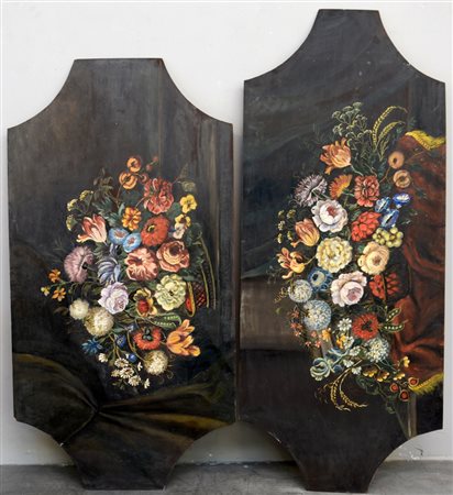 Ignoto "Vasi con fiori", due pannelli ad olio su compensato (cm 55x131 - 61x119)