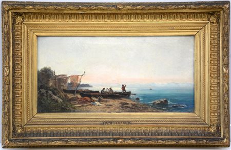 F.W. Beurlin "Paesaggio marino con pescatori". Olio su tela (cm 31x64)....