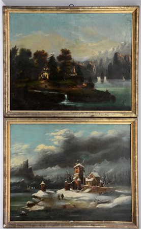 Ignoto, sec XIX "Paesaggi lacustri con figure", coppia di olii su tela (cm...