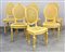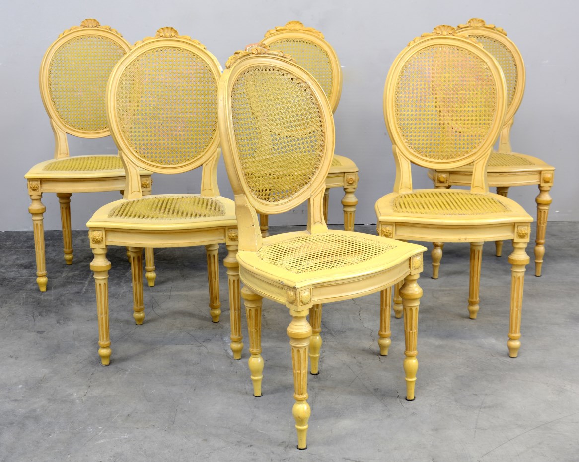 Gruppo di dodici sedie in legno laccato giallo con schienale sagomato e fregio intagliato. Piedi torniti e scanalati. Seduta e schienale in paglia di Vienna