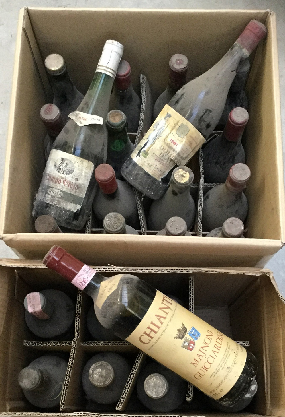 Lotto composto da numerose bottiglie di vino di annate e vitigni differenti, due cartoni (difetti)