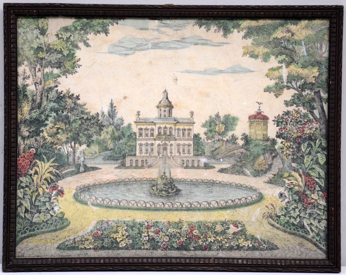Antica stampa a colori raffigurante scorcio di villa con fontana. In cornice (difetti)