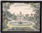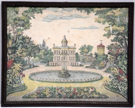 Antica stampa a colori raffigurante scorcio di villa con fontana. In cornice...