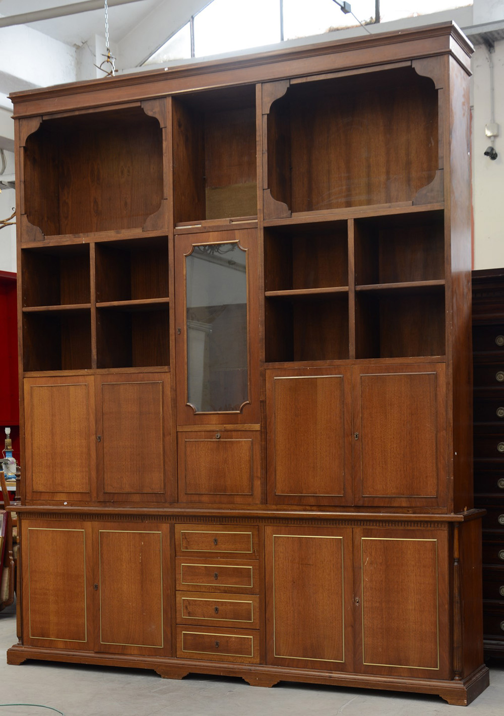 Mobile a due corpi con parte superiore a vani a giorno, anta centrale a vetri e sportelli laterali, parte inferiore a quattro cassetti in linea e quattro antine (difetti) (cm 250x305x45)