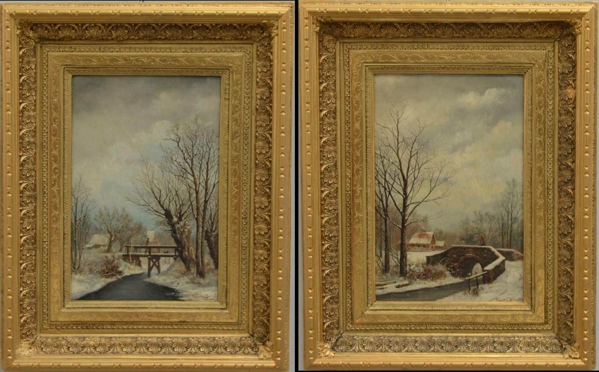 Charles Duval * Coppia di olii su tela raffiguranti paesaggi invernali con figure. Firmati in cornici