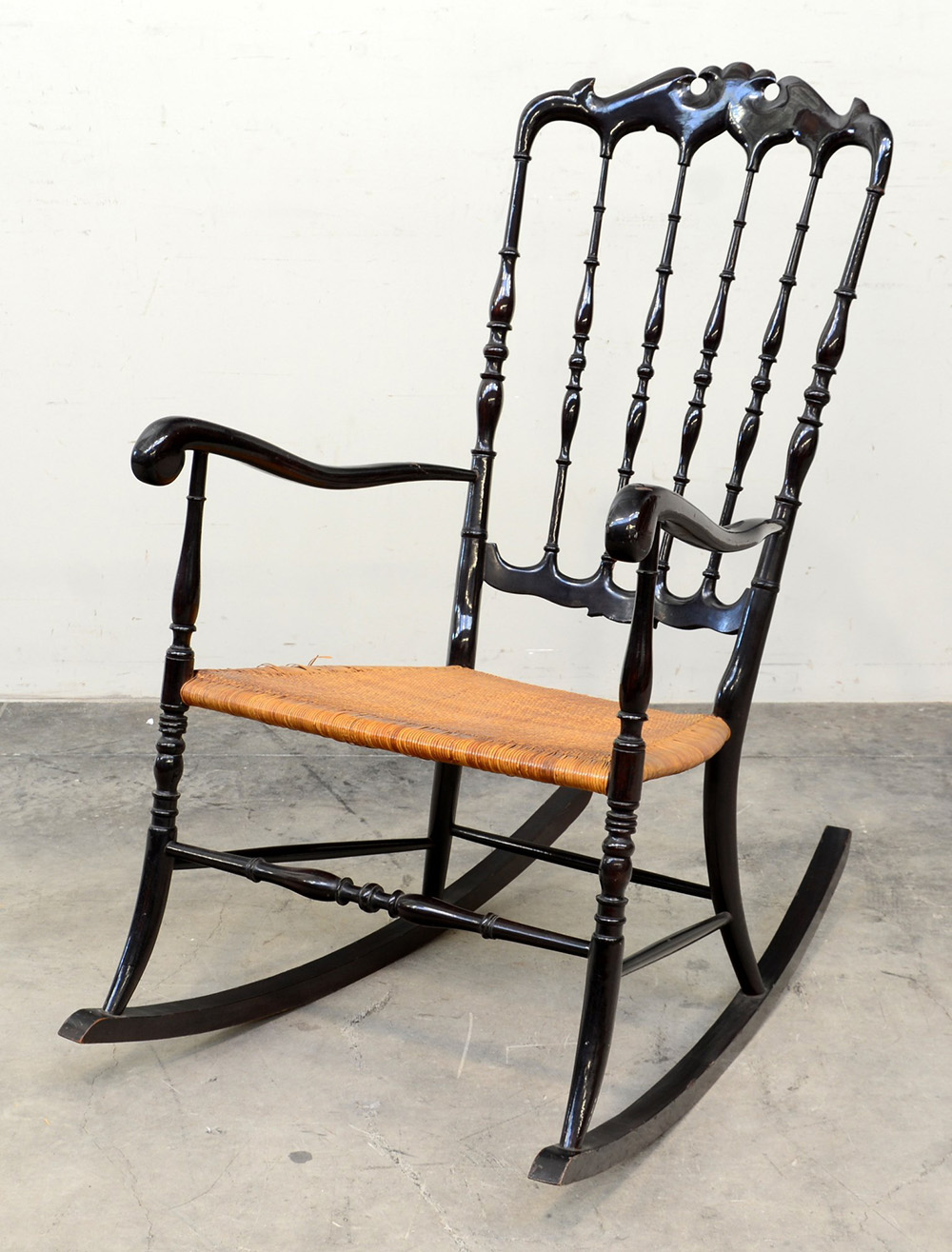 Poltrona a dondolo con schienale a giorno e listelli torniti