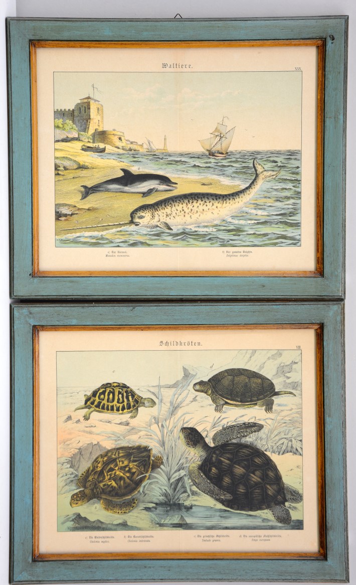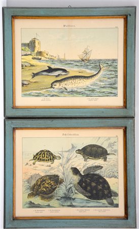 Coppia di stampe a colori raffiguranti pesci e tartarughe. In cornici