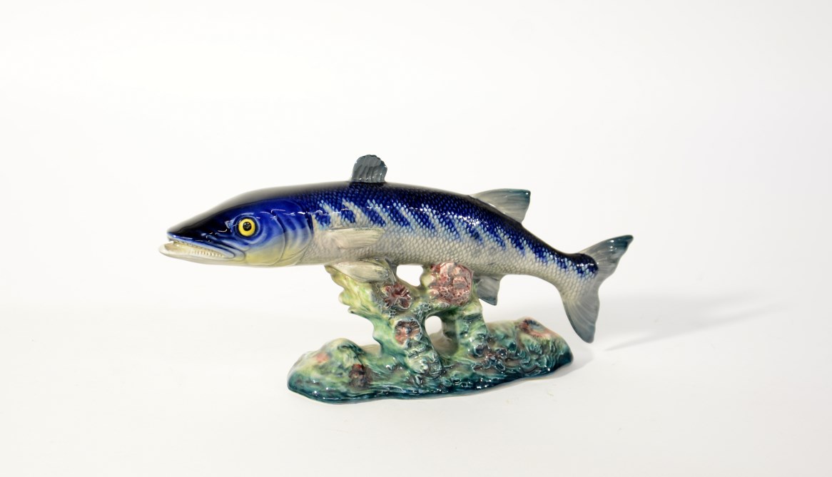 Manifattura inglese, "Pesce barracuda", statuetta in ceramica policroma (difetti)