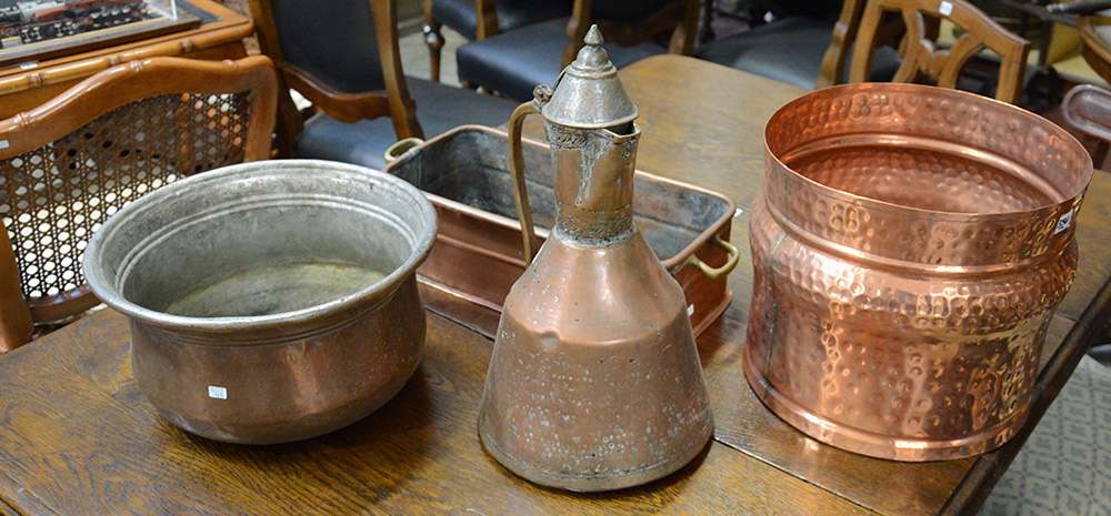Lotto composto da una brocca, tre contenitori in rame e un porta ombrelli in...