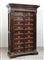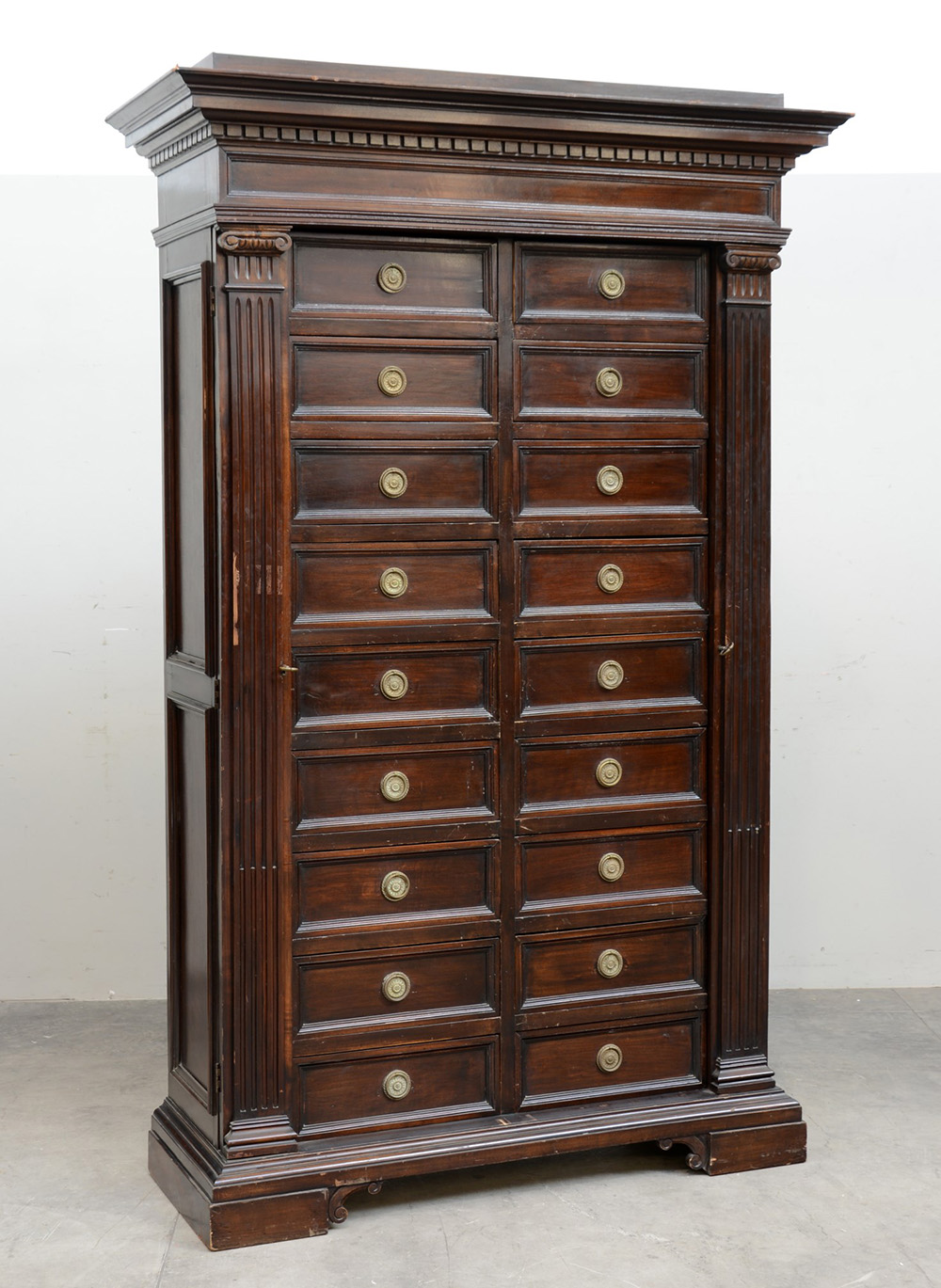 Cassettiera da ufficio a diciotto cassetti riquadrati, montanti a mezza colonna scanalata e intagliata, piedi sagomati. Inizio sec. XX (cm 130x205x53)
