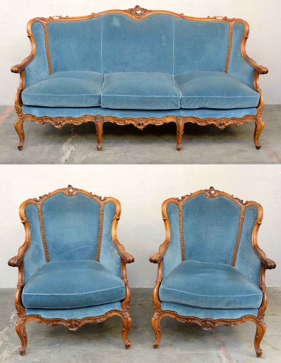 Divano e due poltrone in legno di noce, scolpiti a volute rivestiti in velluto blu, sec. XX