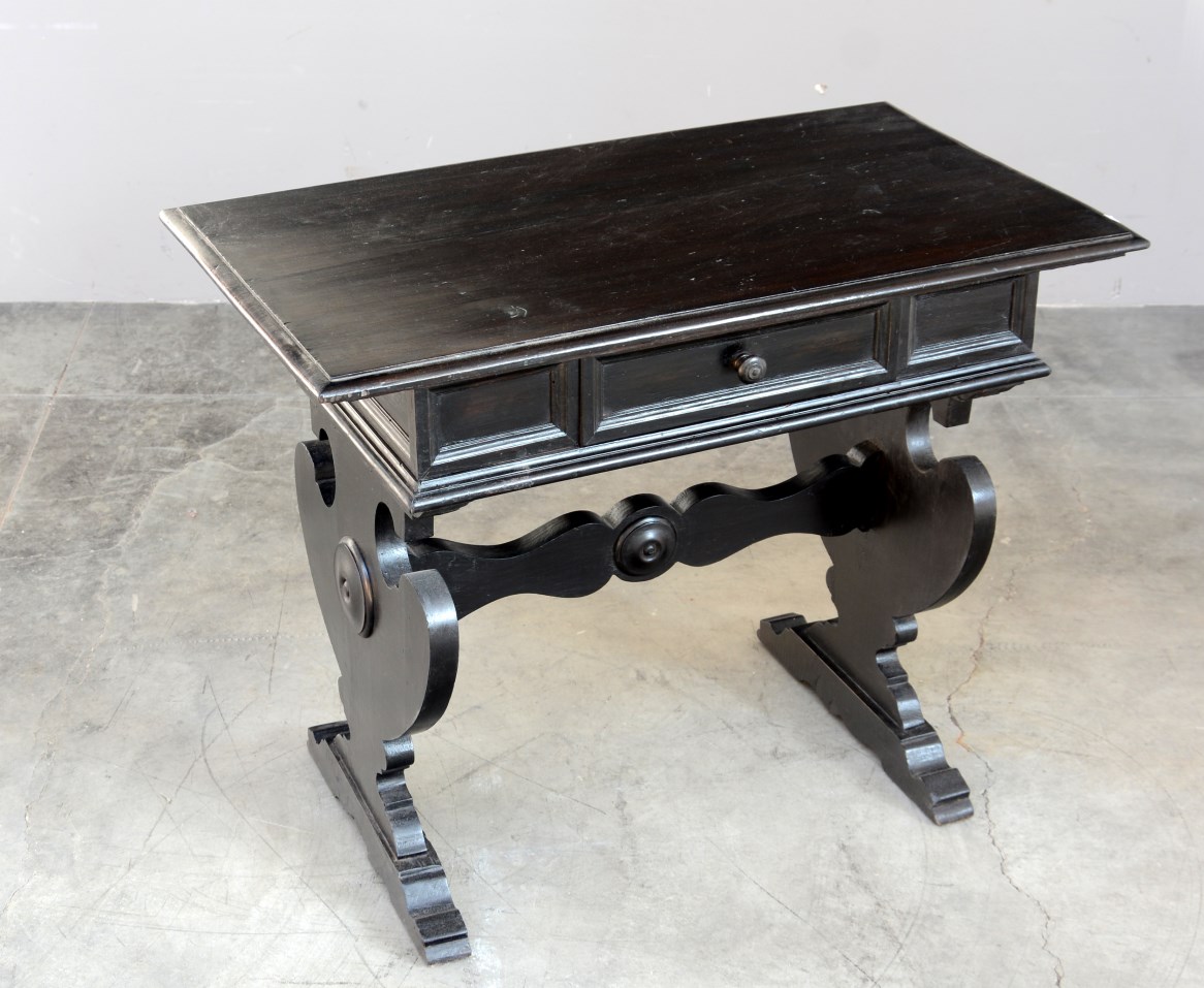 Tavolino rettangolare a un cassetto sottopiano. Gambe sagomate riunite da...