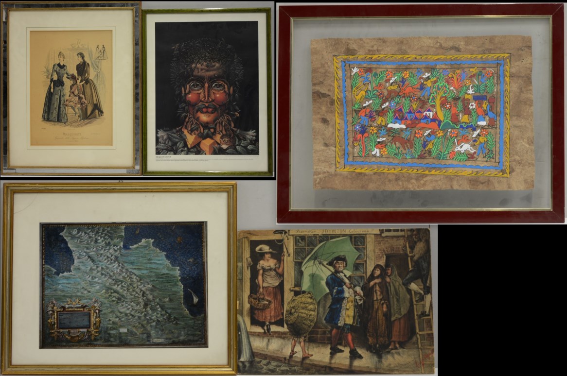 Lotto composto da una stampa a colori, un dipinto su carta e tre riproduzioni diverse.