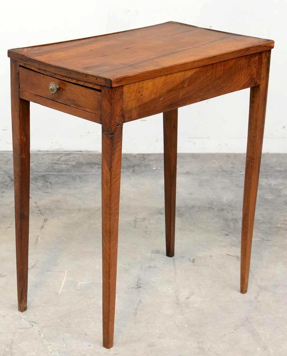 Tavolino rettangolare in noce ad un cassetto nella fascia. Gambe rastremate sec XIX (difetti) (cm 58x70x37)