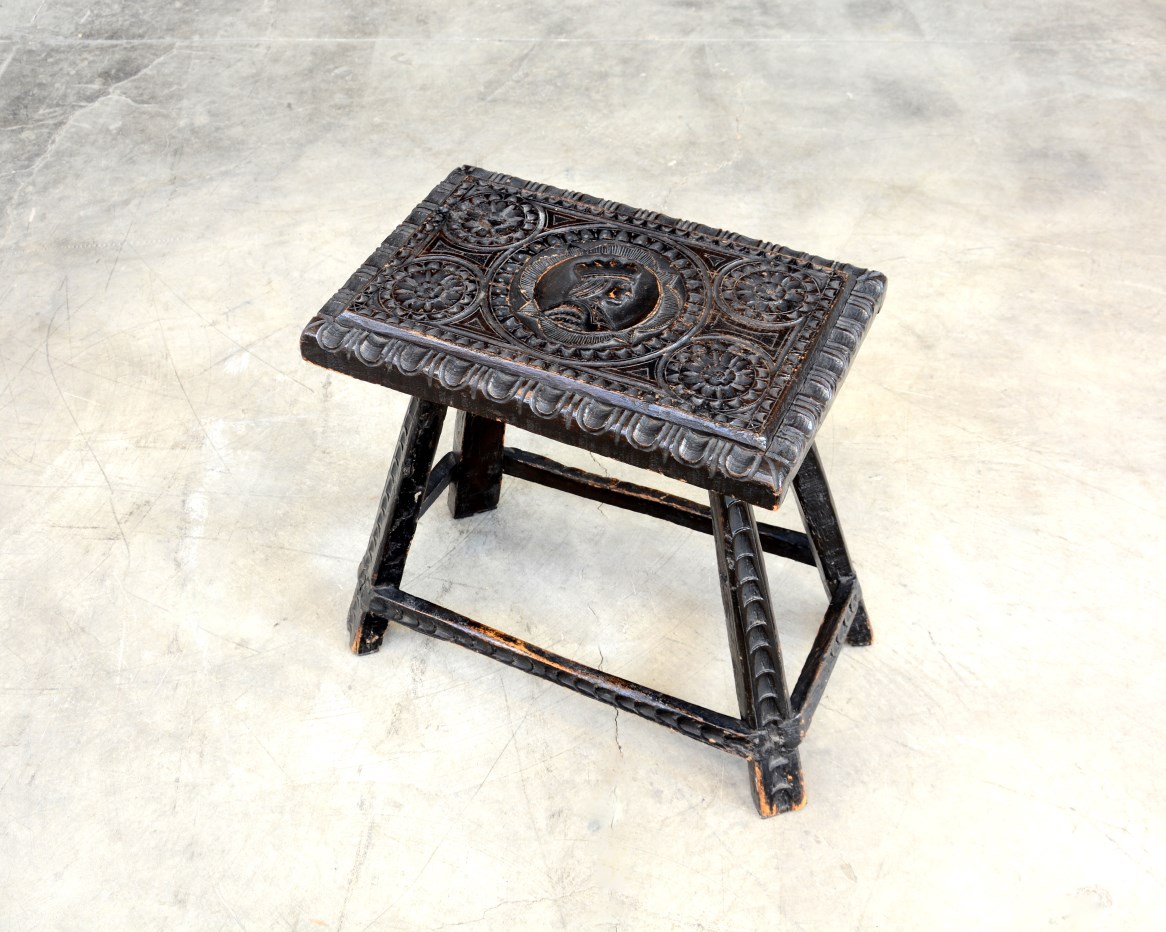 Sgabello rettangolare con seduta intagliata raffigurante profilo maschile e fiori, gambe diritte riunite da traverse. Sec. XIX (difetti)