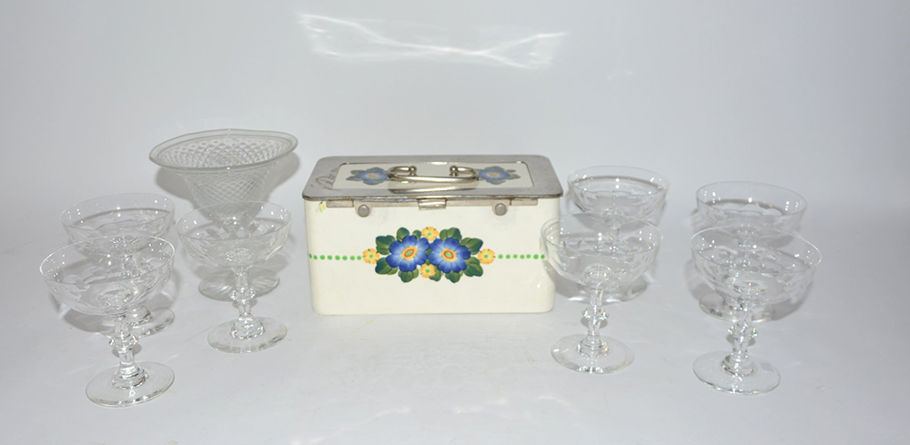 Lotto composto da una biscottiera in ceramica e otto bicchieri in vetro di misure diverse (difetti)