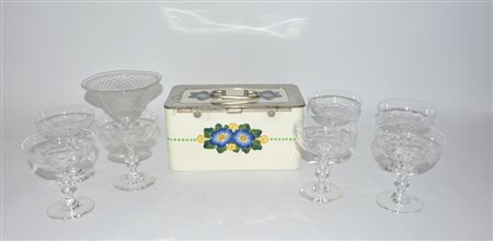 Lotto composto da una biscottiera in ceramica e otto bicchieri in vetro di...