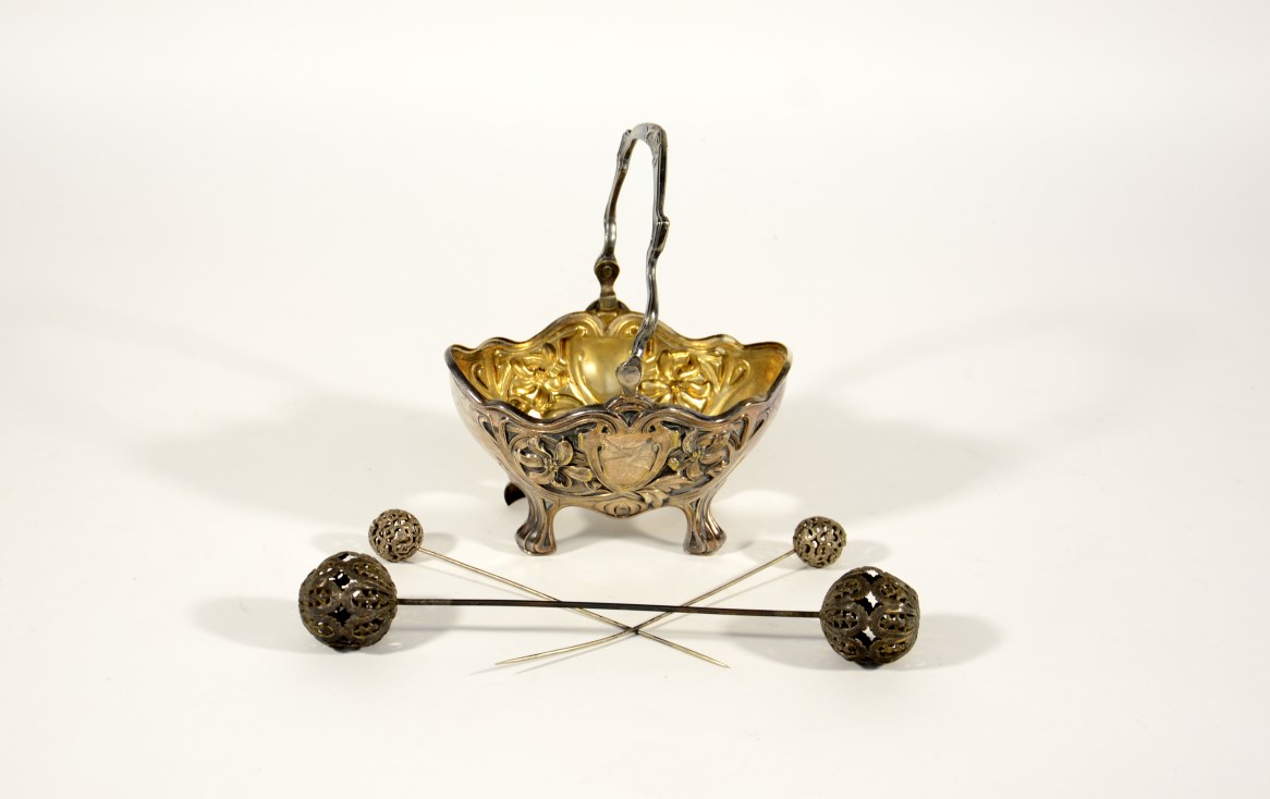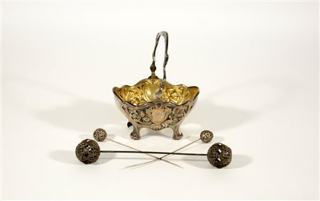 Lotto composto da una ciotolina con manico e tre spilloni in metallo argentato (mancanze)