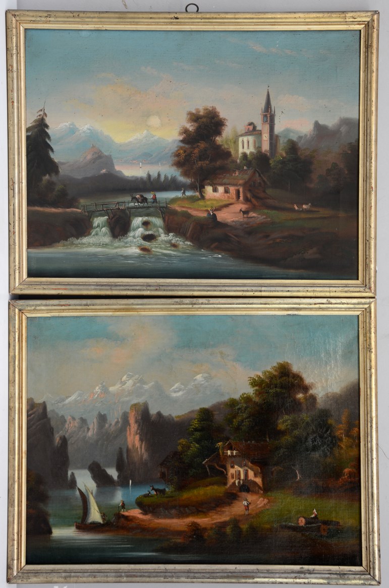 Ignoto, sec XIX, "Paesaggi lacustri con contadini", coppia di olii su tela (cm 41x56). In cornici