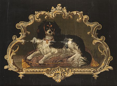 Scuola inglese di fine secolo XIX "Cucciolo cane Cavalier King Charles adagiato su cuscino" olio su carta applicata su tavola (cm.72x100). In cornice English school of the 19th century "Cavelier King Puppy on a Cushion" oil on panel and paper applied on panel. Framed