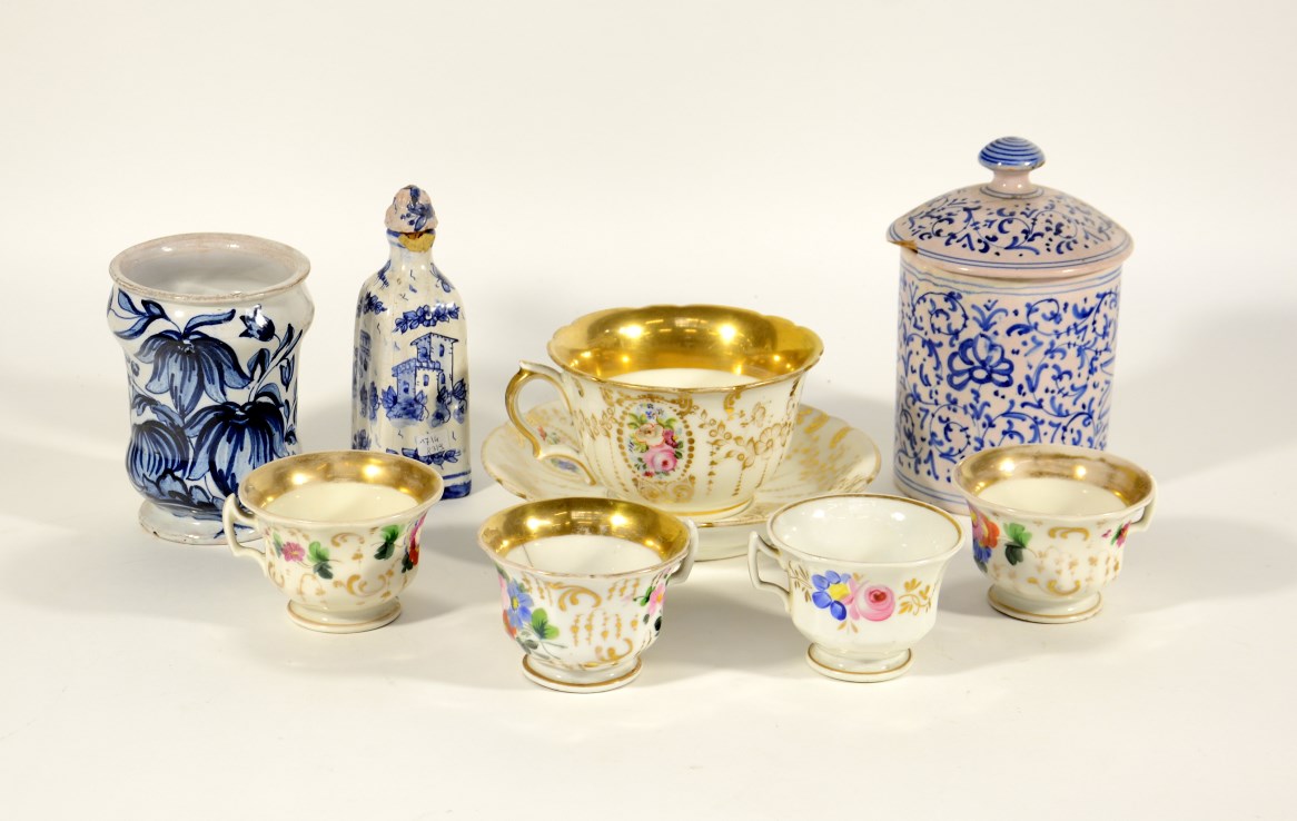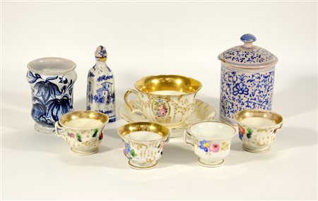Lotto composto da cinque tazzine, un piattino, un albarello e due contenitori...