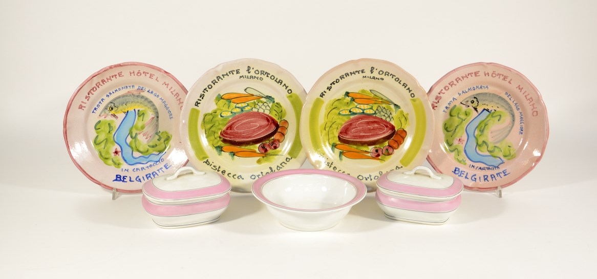 Lotto composto da due scatole con coperchio, una ciotola e quattro piatti del Buon Ricordo in ceramica policroma (difetti)
