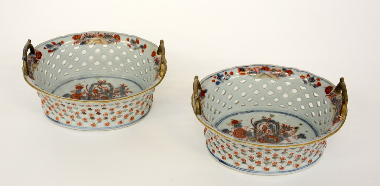 Coppia di cesti traforati in porcellana decorati a smalti Imari, sec. XVIII (l. cm 18) Cina (restauri)