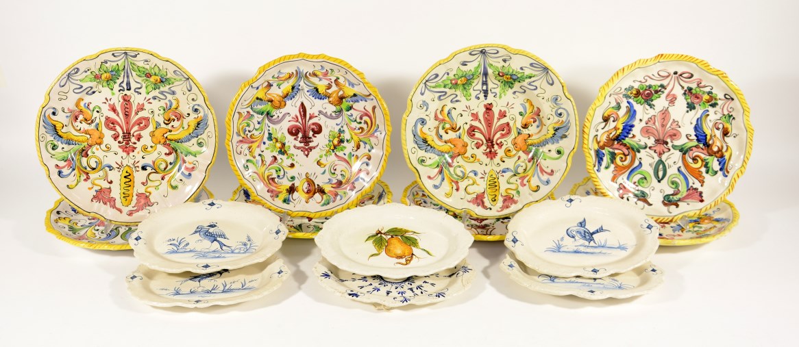 Otto piatti in maiolica con decoro a raffaellesche (difetti) e sei vassoietti...