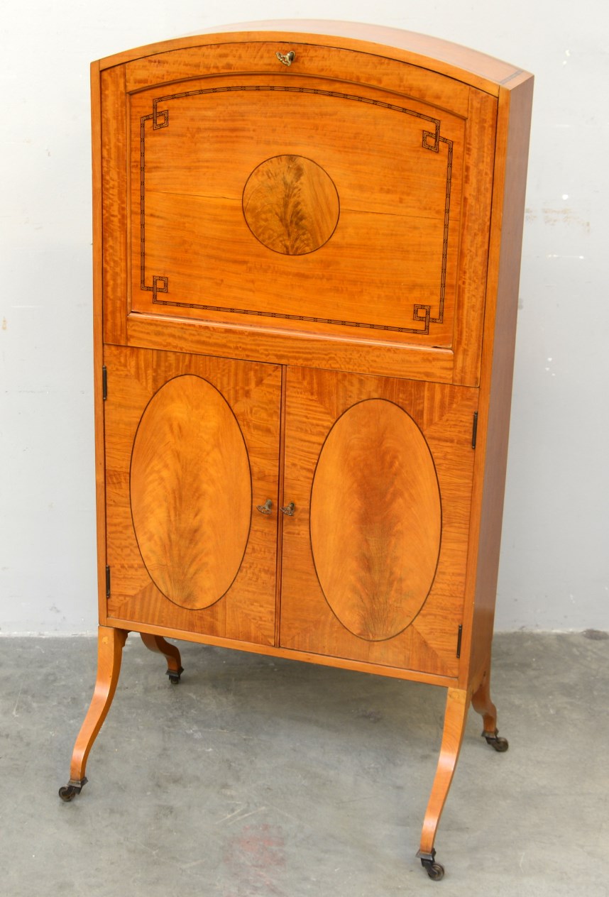 Piccolo secretaire in acero intarsiato con decori a medaglione, entro la...