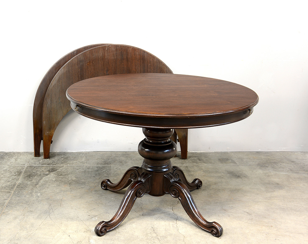 Tavolo tondo allungabile con gamba centrale tornita terminante a tre piedi sagomati. Munito di due prolunghe (d cm 109, h cm 78)
