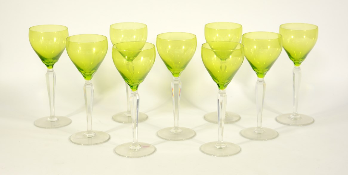 Lotto 3669 | Nove bicchieri a calice in vetro con coppa verde