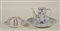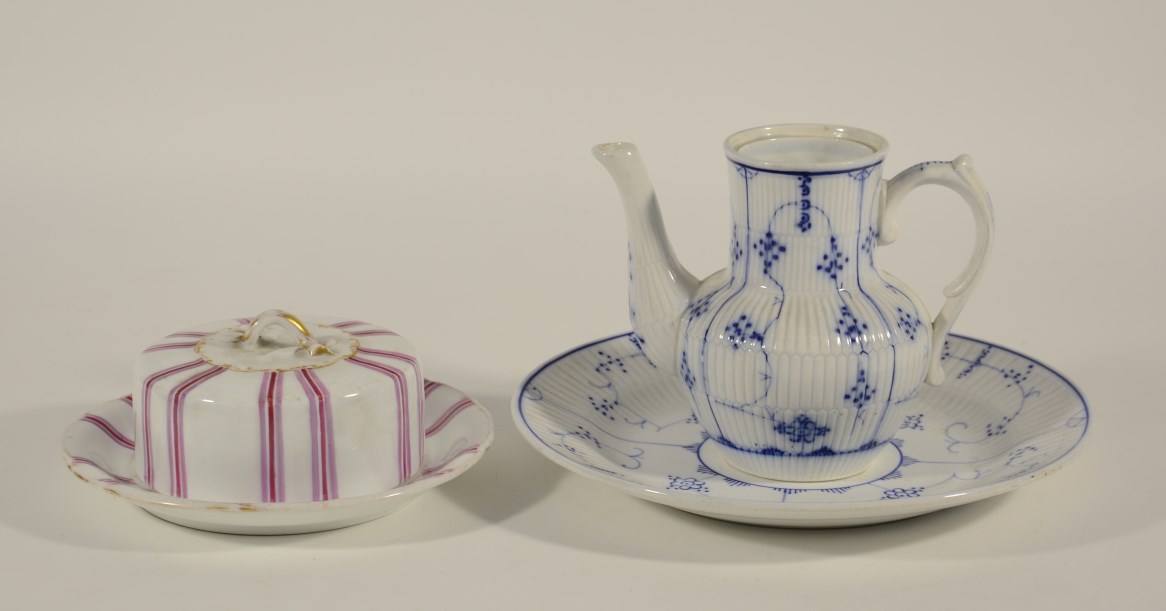 Burriera in porcellana a righe rosa; unita ad una caffetiera e un piatto in...