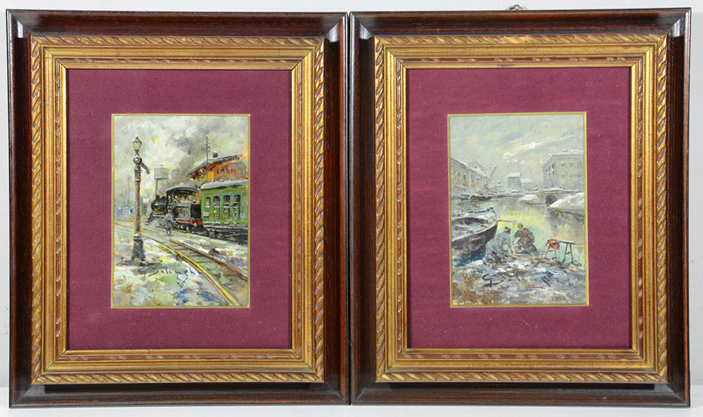 Lotto composto da due dipinti raffiguranti scorci di Milano ad olio su compensato (cm 18x13) firmati Solenghi. In cornici