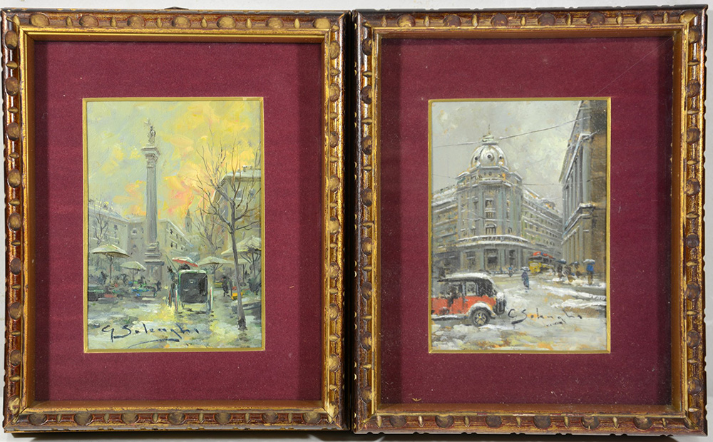 Lotto composto da due dipinti raffiguranti scorci di Milano ad olio su compensato (cm 18x13) firmati Solenghi. In cornici