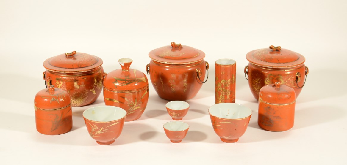 Lotto composto da parte di servizi da tÈ cinese in porcellana monocroma arancione con decorazioni in oro, composta da due tazzine piccole, due grandi, una tazza con coperchio, una scatola con coperchio con annessa tazzina, un vaso cilindrico per contenere piccoli utensili e tre scatole con coperchio biansate per conservare le foglie da te, manifattura orientale (varie misure)(difetti)