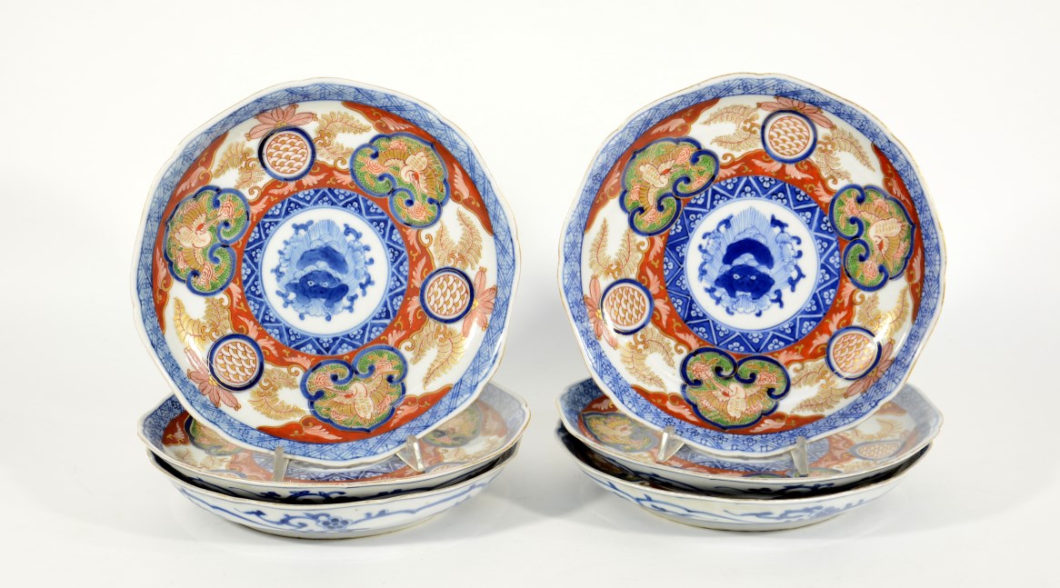 Lotto 3703 | Sei piatti in porcellana in stile Imari con decorazione zoomorfa, marchio...